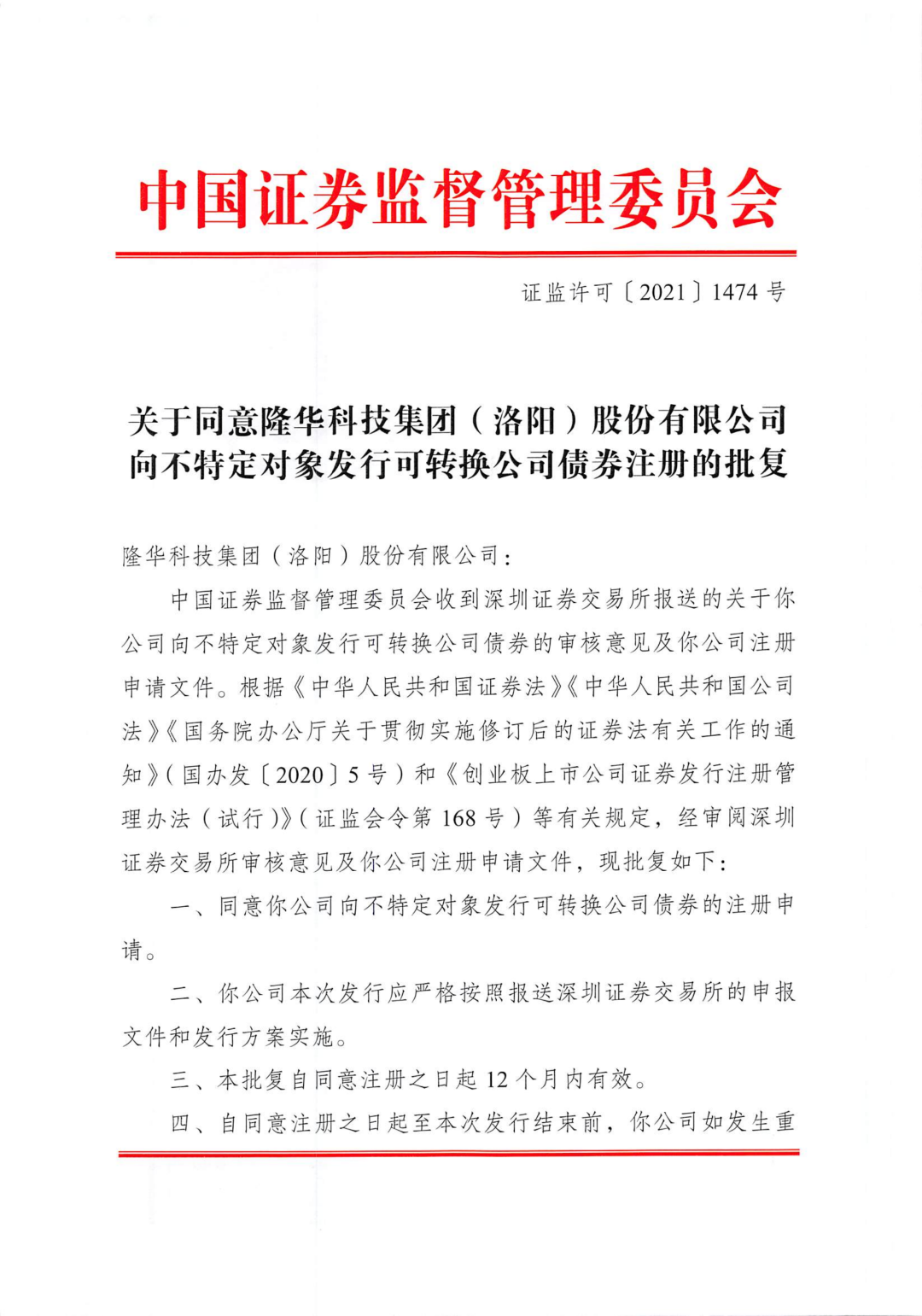 近日,隆华科技收到中国证券监督管理委员会出具的《关于同意隆华科技集团(洛阳)股份有限公司向不特定对象发行可转换公司债券注册的批复》(证监许可〔2021〕1474号)。